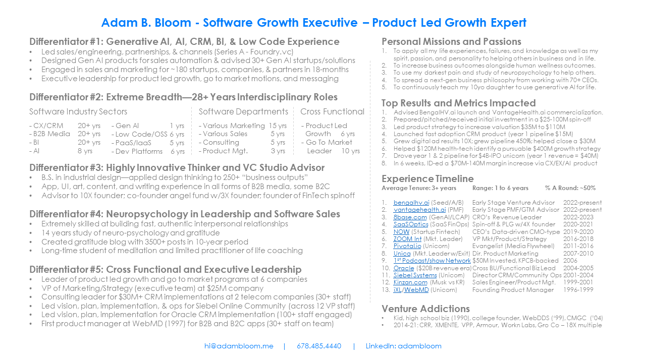 1) With 25+ years in the software industry—in AI, “full-spectrum” CRM, BI, cloud platforms, & low code experience—I currently help companies with revenue growth by using Generative AI across all go to market motions.